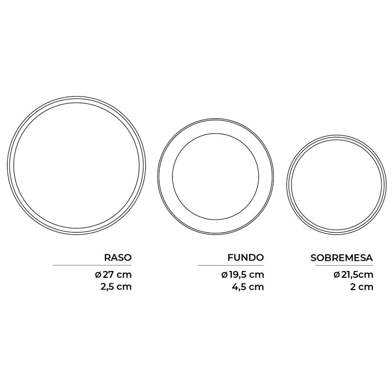 Composição: 6 pratos rasos Ø27 cm / 6 pratos fundos Ø21,5 cm / 6 pratos de sobremesa Ø19,5 cm